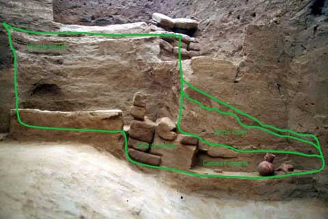 Figura 11. Tumba M-U 1411, la tumba de bota Mochica Medio más grande excavada en SJM. Nótese el tamaño de la pared que sirvió como sello de entrada, las dimensiones de la cámara funeraria y su contenido.