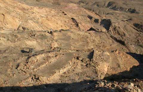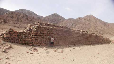 Figuras 16. San Ildefonso, sitio Mochica Tardío ubicado en la zona desértica aledaña a la desembocadura del Rio Chamán, posiblemente uno de los centros políticos locales. El sitio incluye tres líneas de murallas defensivas, así como componentes ceremoniales, unidades residenciales y de almacenamiento.