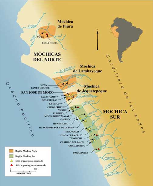 Figura 1. Mapa de la Costa Norte del Perú con la ubicación de los principales sitios arqueológicos Mochicas, en la región Mochica Sur y en las tres áreas de desarrollo de la región Mochica Norte.