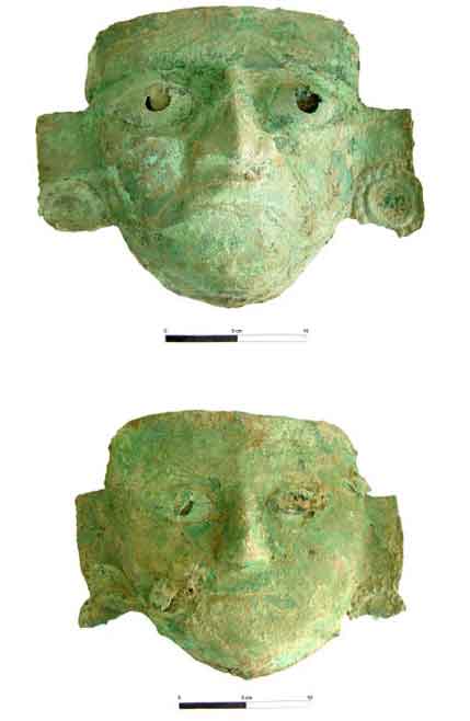 Figura 20. Máscaras funerarias asociadas con los niveles inferiores de la cámara M-U 615. Nótese el parecido con la máscara funeraria de la Sacerdotisa Mochica Tardía hallada en la tumba M-U 41 (ver Donnan y Castillo 1994, Lámina XV-2).