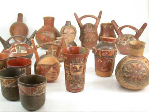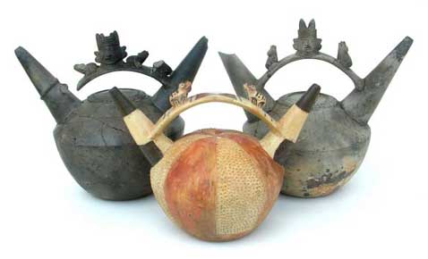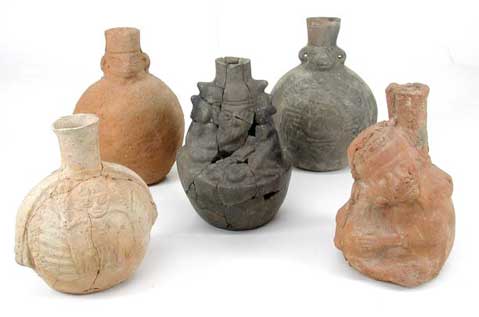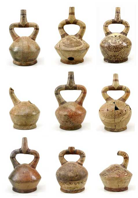 Figura 5. Botellas de asa estribo de estilo Mochica Tardío decoradas con diseños en línea fina excavadas en San José de Moro.