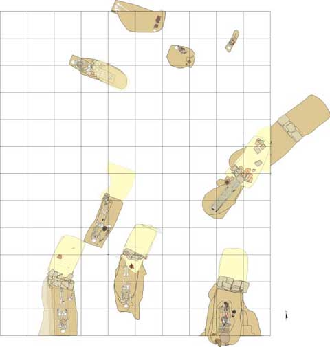En el otro extremo de la historia ocupacional del sitio, en el Periodo Mochica Medio, las excavaciones se concentraron en áreas de densas concentraciones de tumbas. El estudio de las concentraciones funerarias, de sus distribuciones y diferencias relativas aportaron importante información para en-tender el desarrollo del valle de Jequetepeque. Entre las temporadas del 2000 y 2002 hallamos una concentración de casi 30 tumbas Mochica Medio dispuestas una al lado de otra en un área de excavación de 250 metros cuadrados (Del Carpio, en prensa; Figuras 23 y 24). Este hallazgo, sumado a un numero semejante de tumbas del mismo periodo encontradas dispersa en diversos sectores de excavación, permitió ahondar en el entendimiento de los patrones funerarios durante el período Mochica Medio; de esta forma se determinó la posible existencia de concentraciones que corresponderían a diferentes grupos, quizás originarios de diferentes comunidades del valle de Jequetepeque o de otras regiones.