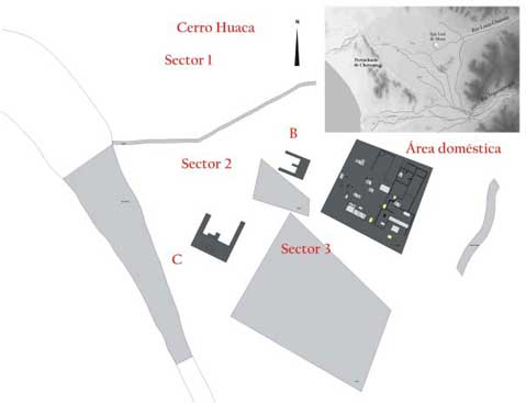 Al iniciarse la segunda fase del proyecto, el estudio de las prácticas funerarias era el componente principal de la investigación en SJM. Aun cuando se había excavado un número considerable de tumbas de bota y cámaras funerarias, subsistían muchas dudas respecto a su representatividad y al contexto general del sitio como entorno ritual en el que se habían realizado las prácticas funerarias de élite. En los primeros años nos habíamos topado con entierros un tanto extraños, como tumbas Lambayeque con individuos extendidos o tumbas que contenían una cantidad de cerámica Cajamarca apreciable, al lado de formas de una tradición costeña indefinida (Castillo y Donnan 1994a). El estudio del contexto ritual asociado con las prácticas funerarias no había avanzado mucho en la primera fase, pues el área adyacente a la Huaca La Capilla, donde se habían concentrado las excavaciones, no contenía mucha evidencia de actividades ceremoniales (Figura 3).
