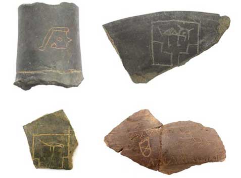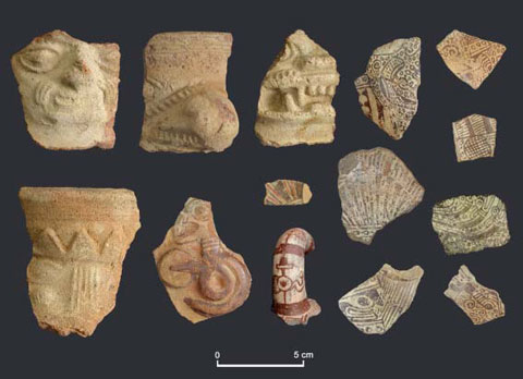 Definir la secuencia ocupacional fue una de las prioridades del proyecto desde que iniciamos los trabajos en SJM. El sitio es, sin duda, uno de los más singulares yacimientos arqueológicos de la costa norte por su larga ocupación y compleja estratigrafía. La mayoría de los montículos que lo conforman consiste en superposiciones continuas de capas de ocupación y capas de rellenos que, en algunos casos, alcanzan hasta los ocho metros. Asociado con estas capas, pisos y superficies de ocupación aparece una gran cantidad de material cultural, particularmente fragmentos de cerámica, que incluye elementos que fácilmente podemos reconocer y otros de formas y decoraciones que resultan francamente desconocidos. Algunos de los ejemplos más curiosos son la cerámica negra estampada, que evidentemente no era de filiación Lambayeque o Chimú, y la cerámica de estilos Cajamarca o polícroma (Figura 4). Fue evidente, entonces, que la historia ocupacional del sitio, documentada en detalle y relacionada con artefactos tipos, tomaría más tiempo en ser definida. La dimensión cronológica de nuestra investigación, en relación con la evolución de los estilos y con los fenómenos que moldearon el sitio y la región, a la larga ha resultado un problema que viene tomando los 16 años del proyecto, cada vez mejor entendido, pero nunca resuelto (Castillo ms.). Durante la primera fase la Dra. Alana Cordy-Collins, Don y Donna McClelland, Ulla Holmquist, Marco Rosas, Carlos Wester y Carmela Zanelli fueron fundamentales para el éxito del proyecto.