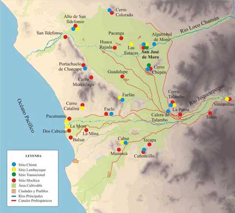 Figura 2. Mapa del Valle de Jequetepeque con la ubicación de los principales sitios ocupados durante los Periodos Mochica, Transicional, Lambayeque y Chimú.