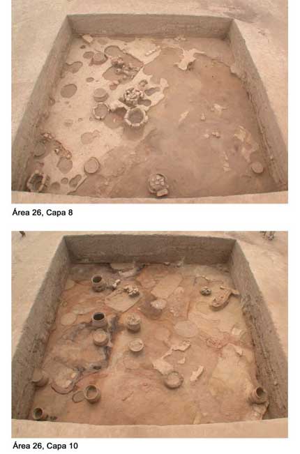 A medida que se extendía el área excavada nos percatamos de que la ocupación del sitio a lo largo de su secuencia cultural no había sido homogénea. Las ocupaciones eran más densas en los montículos, donde la estratigrafía podía ser el doble que la que encontrábamos en la cancha de fútbol, incluyendo mucha más evidencia de actividades domésticas. Adicionalmente, en las zonas llanas del sitio, las ocupaciones parecían concentrarse en núcleos de actividad, donde las evidencias de una u otra ocupación eran mayores. Esta falta de homogeneidad en la dispersión de los elementos también caracteriza la concentración de tumbas. La Unidad 24, por ejemplo, contuvo 24 tumbas Mochica Medio (Del Carpio en prensa), mientras que la Unidad 17-20 no tuvo ninguna. Esta tendencia a la concentración de las actividades funerarias no es exclusiva de los periodos Mochica; en la Unidad 9 se excavó una gran cantidad de tumbas Lambayeque, mientras que en otras unidades eran prácticamente inexistentes.