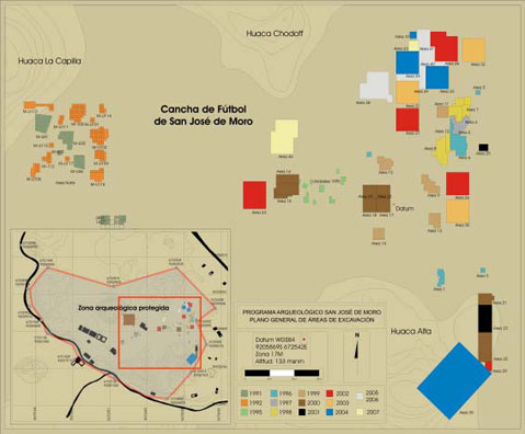 Figura 3. Plano de San José de Moro con indicación de los montículos y las áreas excavadas entre 1991 y 2007.