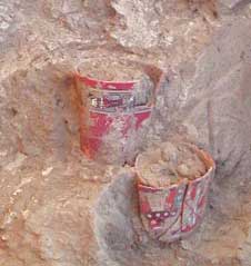 Figura 12. Impronta en arena de un ataúd de cañas hallado en la tumba de bota Mochica Medio M-U 1062. Nótese el parecido con los ataúdes de caña usados en Pacatnamú (ver Donnan y McClelland 1997).