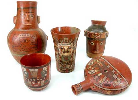 Un aspecto peculiar de la cerámica asociada a las tumbas Mochica que excavamos en los primeros años fue la inusual presencia de artefactos con for-mas y decoraciones muy diferentes a la cerámica reportada en otros sitios Mochicas, particularmente con excavaciones llevadas a cabo en los valles de Chicama, Moche, Virú y Santa. Había, por ejemplo, una gran cantidad de cerámica reducida, decorada con diseños en relieve; botellas de cuerpos achatados (flasks) con decoraciones en relieve en el cuello, cántaros con cuerpos carenados, piezas de cuerpos múltiples, botellas cilíndricas, así como ollas con cuerpos cubiertos por bultos y cuellos-plataforma. Las formas que esperábamos encontrar, como los cántaros con cuellos o los «floreros, las botellas modeladas y con diseños geométricos», típicos de los entierros de la Huaca de la Luna (Donnan y Mackey 1978) y de las colecciones del Museo Larco (2001), brillaban por su ausencia. Paradójicamente, en vez de estas formas apareció por primera vez en contexto una importante cantidad de cerámica polícroma, tanto del estilo Mochica Polícromo y copias hechas en SJM de formas foráneas (Castillo 2000b) como de cerámica importada de la costa central y sierra sur, de estilos Wari Conchopata, Chaquipampa y Viñaque, Atarco, Nievería, Pachacamac y cerámica Cajamarca en varios estilos y formas (Figura 4).