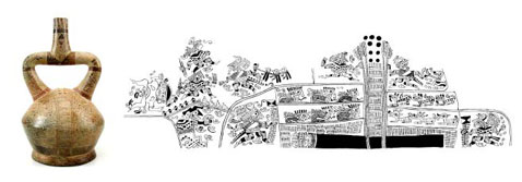 Figura 7. Botella de asa estribo de estilo Mochica Tardío, decorada con el Tema del Entierro, hallada en el Rasgo 15, un depósito subterráneo que contenía cerámica utilitaria para la elaboración de chicha (ver Figura 13).